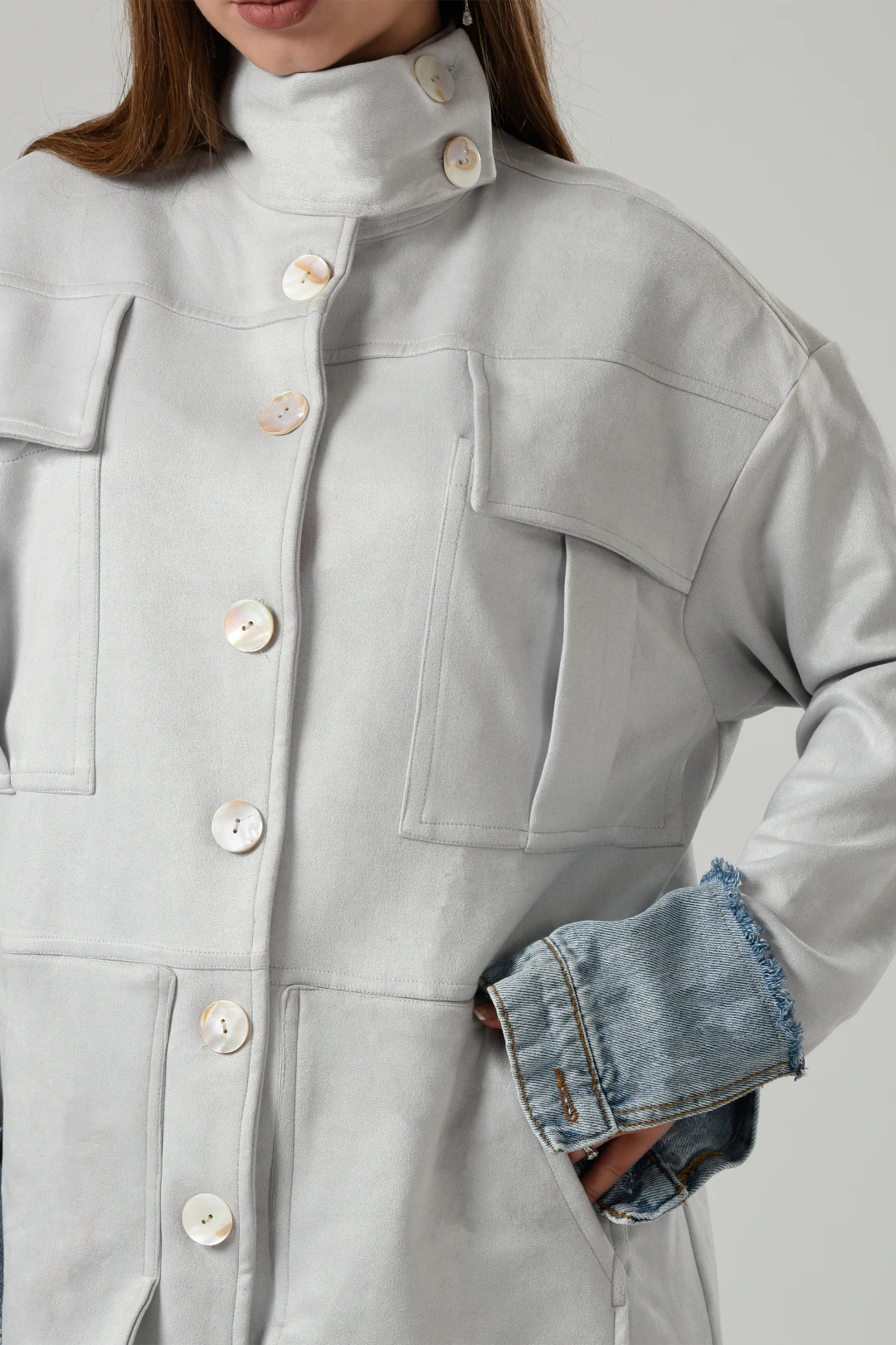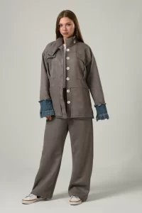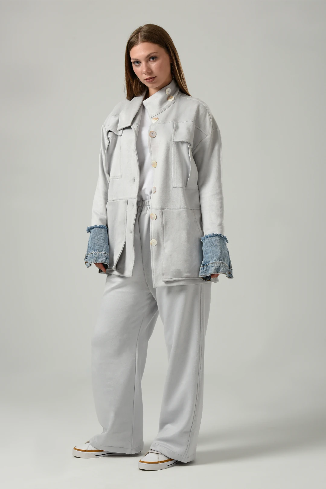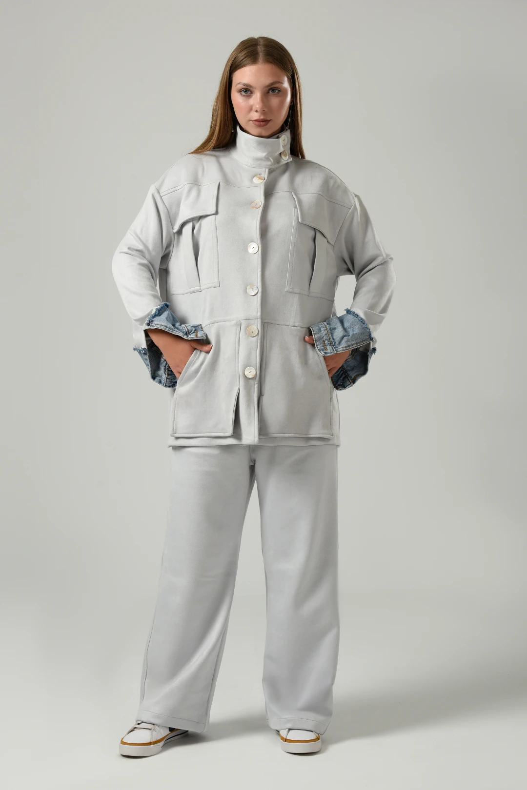 Featuring Double Pockets Suede Set in Light Grey new version from our signature set every winter with high collar buttoned ,long sleeves with jeans details ,four pockets two on the chest and two front pockets with straight hem and pearls buttons with wide leg pants and the finish details will blow up your mind