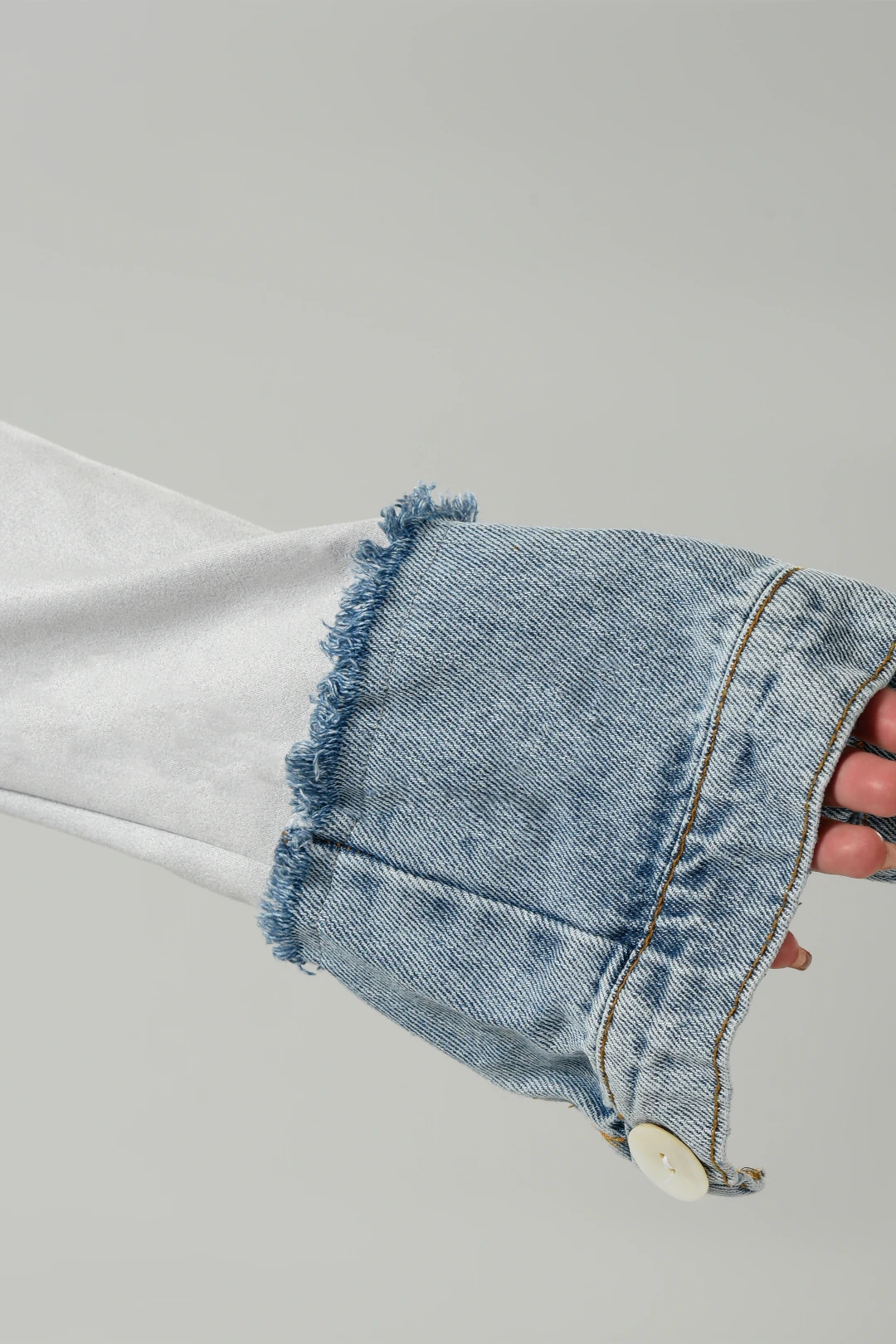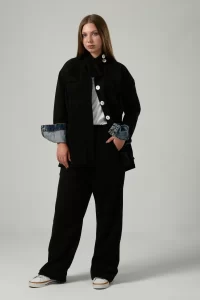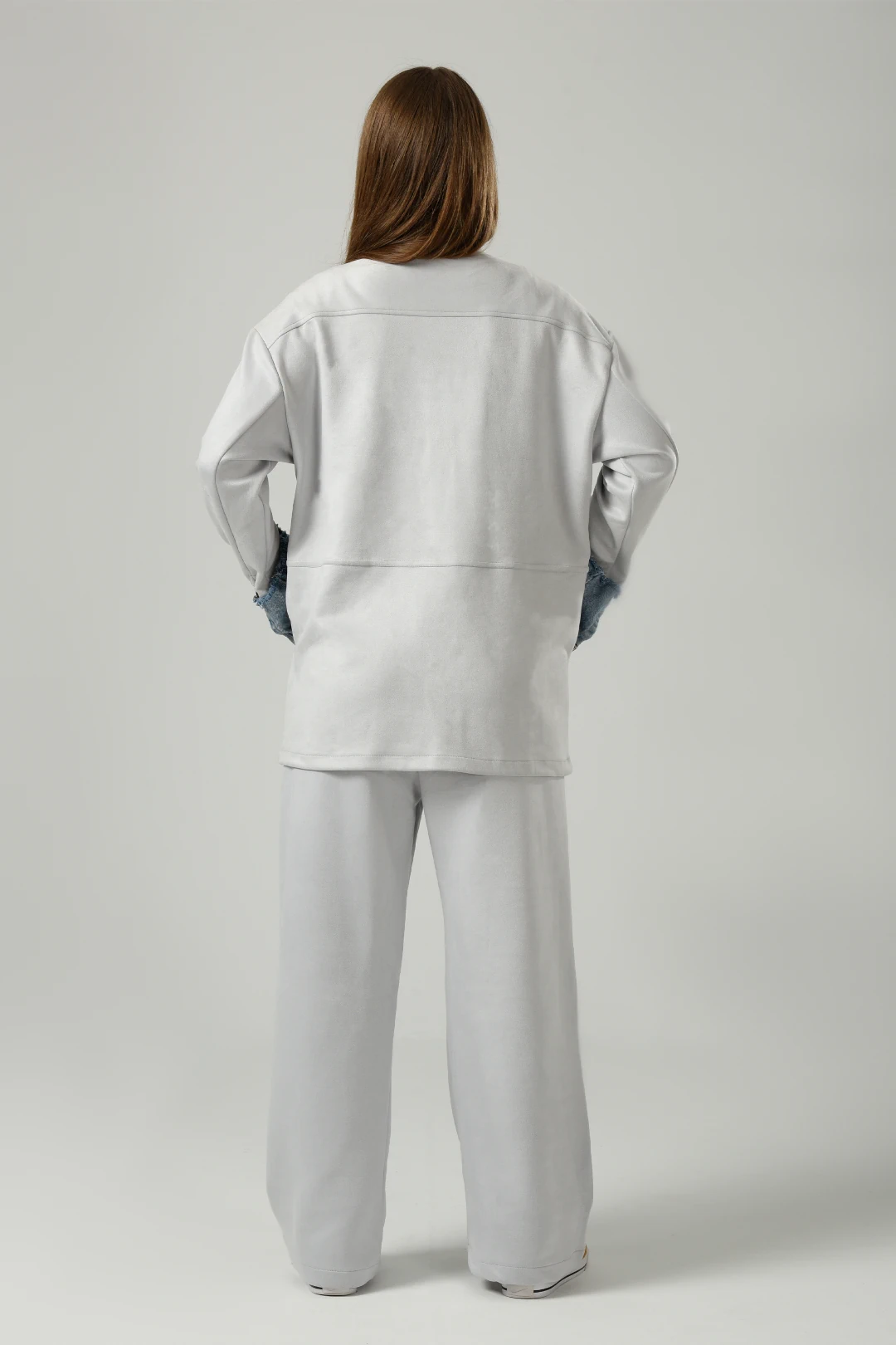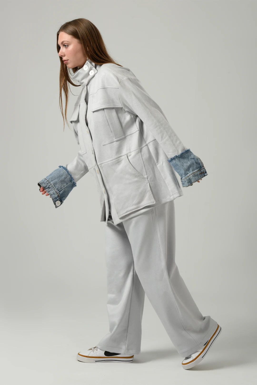 Featuring Double Pockets Suede Set in Light Grey new version from our signature set every winter with high collar buttoned ,long sleeves with jeans details ,four pockets two on the chest and two front pockets with straight hem and pearls buttons with wide leg pants and the finish details will blow up your mind