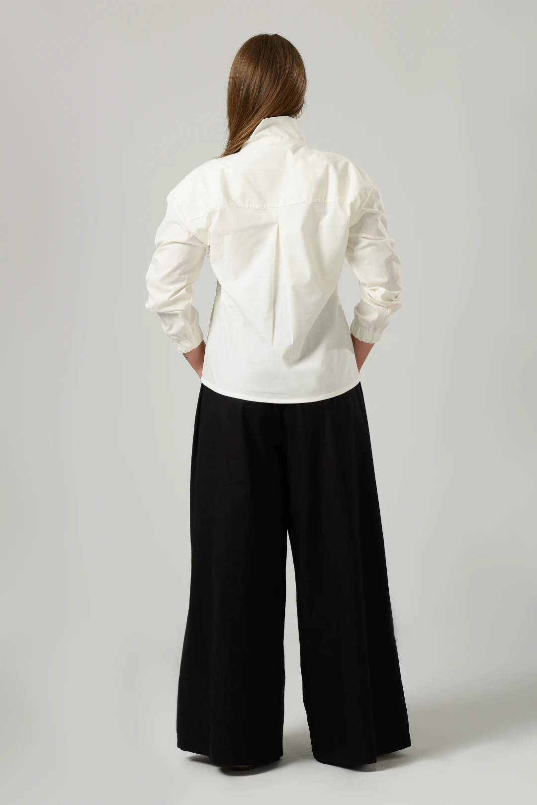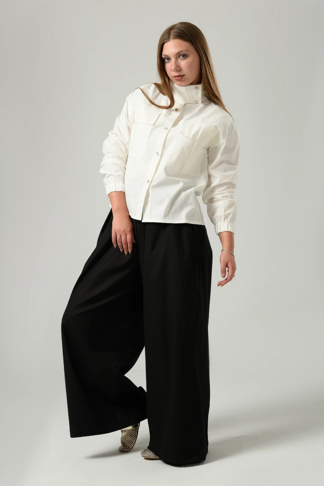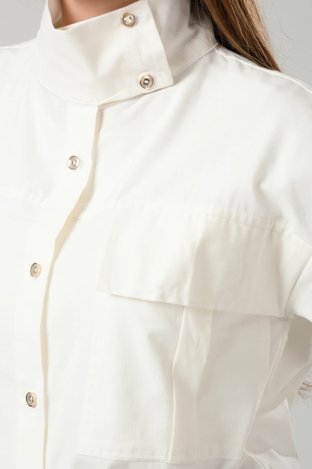 The Pockets Shirt in Off White featured in poplin with to extra front side pockets ,cropped length and front buttons in gold with elastic end long sleeves ,high collar with side two buttons